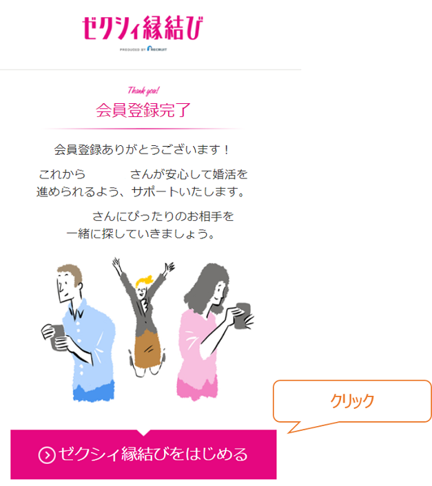 こんな画面になったら、「ゼクシィ縁結びをはじめる」をクリックして登録は完了だ。