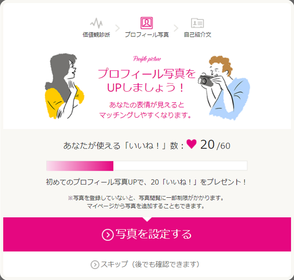価値観診断が終わったら、次はプロフィール写真の設定だ。